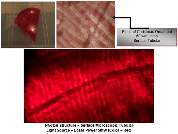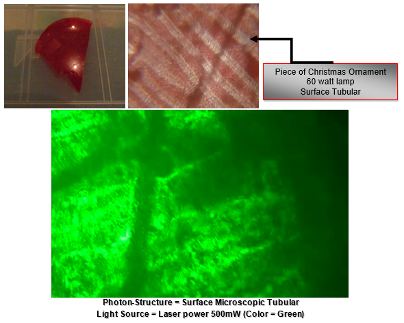 When looking at the Visual Circle the microscope came across as a set of pre-photon structure defined in color images (Associated Laser (Red and Green)), however the characteristic microscopic photon-structure observed resemble the others already analyzed in experiments earlier (Comparison of Photon-structure laser and lamp in the material (Example: Christmas ornament)).